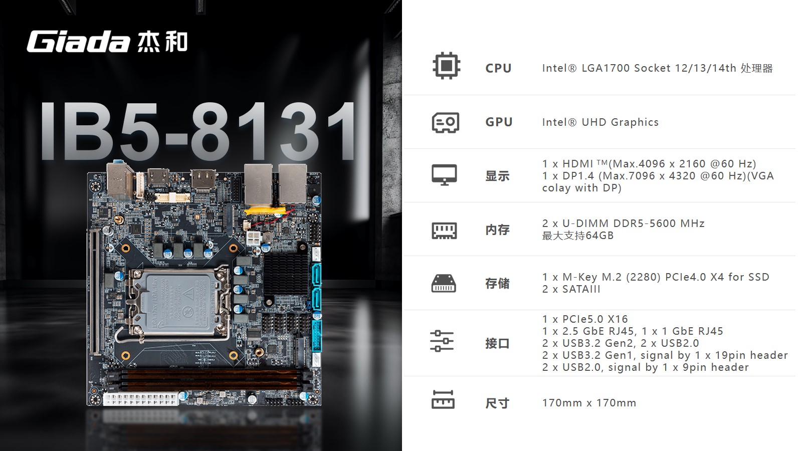 博天堂(btt)Mini-ITX主板IB5-8131采用Intel® B760芯片组,支持Intel® LGA1700 Socket第12/13/14代CPU。支持1 x HDMI (Max.4096 x 2160 @60 Hz);1 x DP1.4 (Max.7096 x 4320 @60 Hz)(保留 VGA位置)。