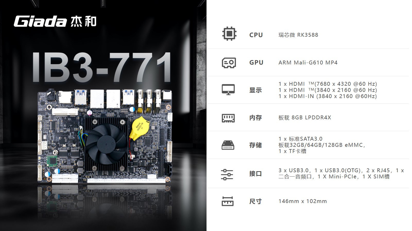 博天堂(btt)工业级ARM主板IB3-771采用瑞芯微RK3588处理器,内置G610 MP4 GPU,拥有6 TOPS算力的NPU,支持8K视频硬件解码编码及多摄像头输入,支持eDP/DP/ HDMI2.1/MIPI 多种显示接口。