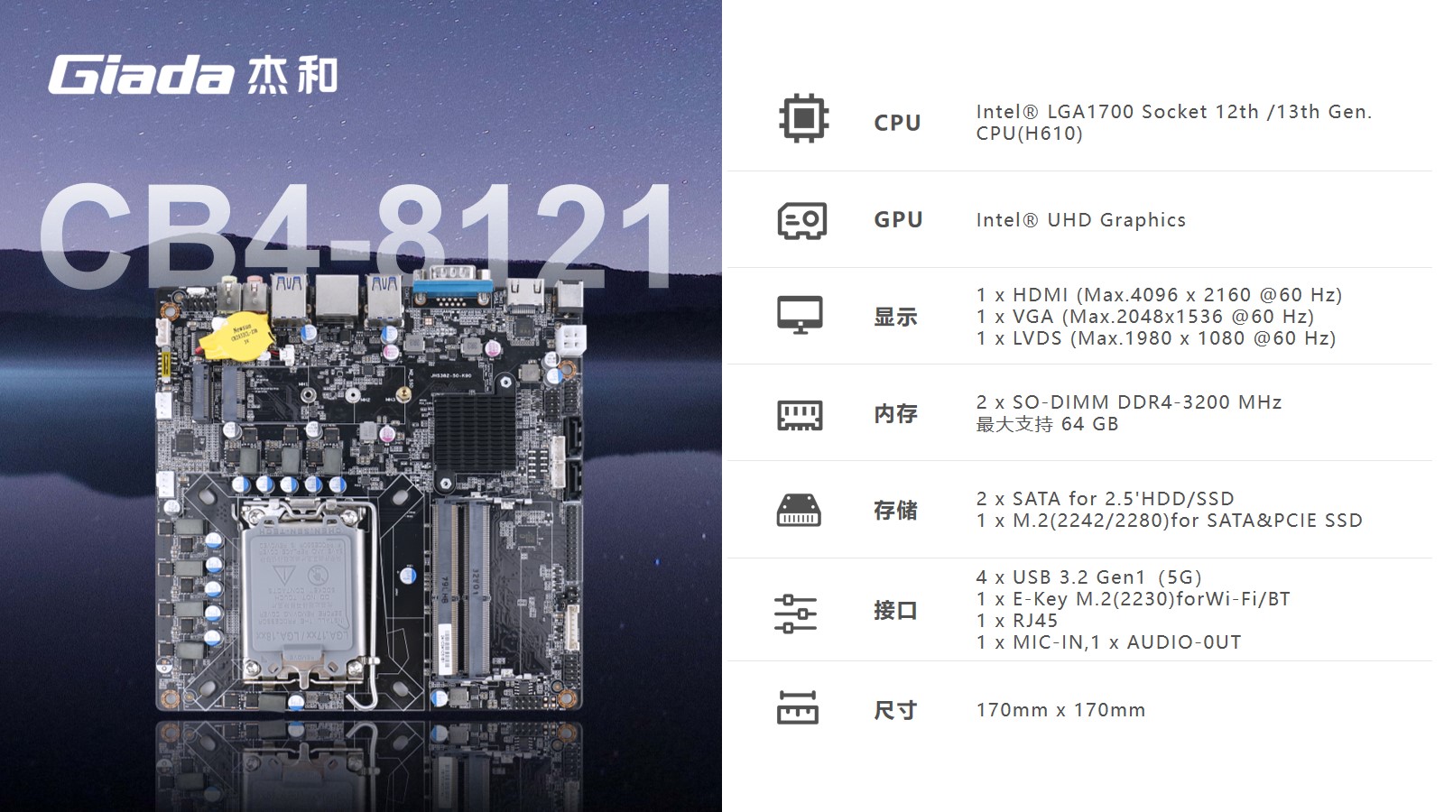 搭载双通道SO-DIMM DDR4-3200MHz内存、1 x M-Key M.2 (2242/2280) SSD和 2 x SATAIII存储。综合考虑到了大部分用户的使用场景需求,搭载Intel® UHD Graphics芯片,支持DirectX 12.1,OpenGL 4.5,OpenCL 3.0,能够为用户带来出色的计算和图形处理性能,无论是运行并载入游戏、数据传输还是平面设计如(PSLRPR等软件),都可以赋予用户更加极致流畅的使用体验。