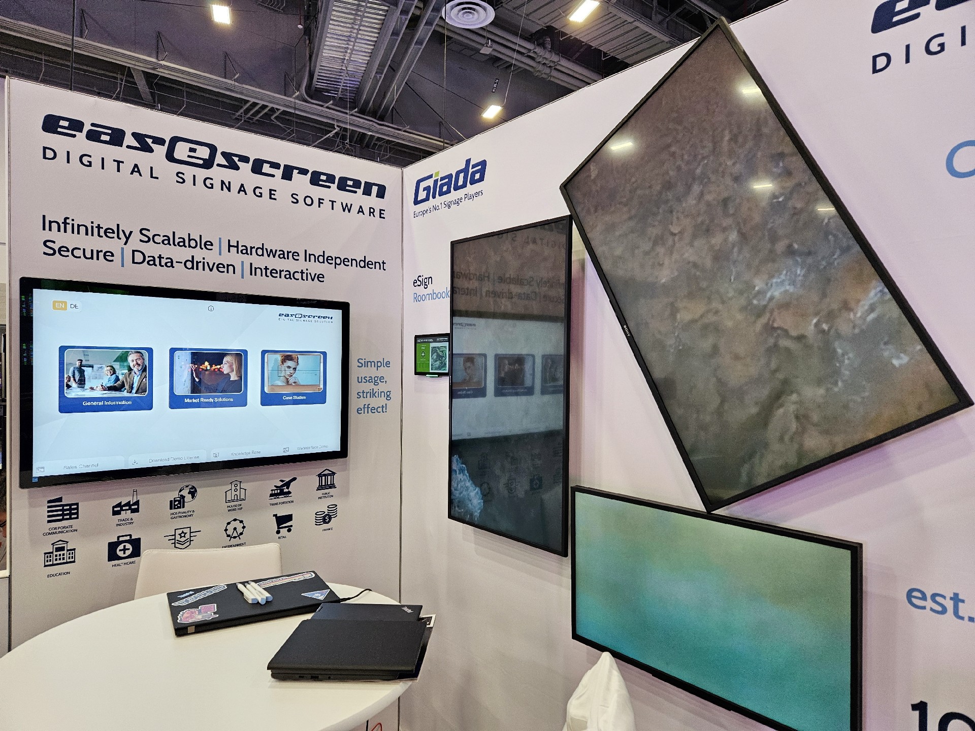 博天堂(btt)科技Giada作为全球数字标牌领域的领导品牌,产品应用范围涵盖全球大型连锁店,购物中心,学校,医疗机构,企业办公室等。本次展会,博天堂(btt)科技牵手合作伙伴easescreen,展示一系列创新数字标牌解决方案,带来强势产品及最新产品,现场收获超高人气。