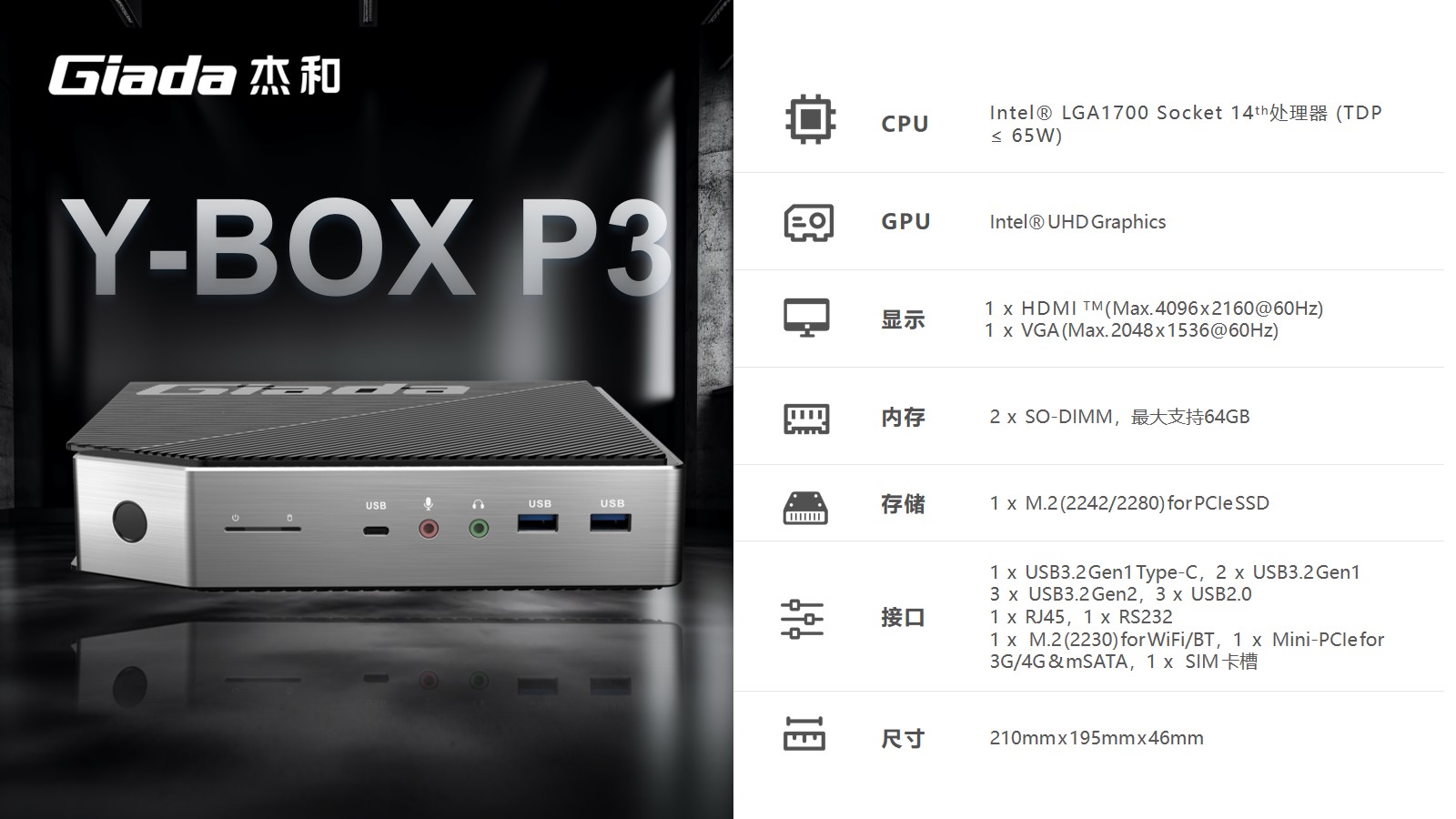 支持指纹解锁,支持type-c接口,支持PD协议的27W快充。博天堂(btt)科技最新云终端Y-BOX P3采用Intel® LGA 1700 Socket CPU插槽设计,支持intel 12~14代酷睿系列处理器,配备i7-14700处理器,20核28线程,最大睿频频率为5.4GHz,处理器基础功耗 65W。采用双通道笔记本内存槽设计,最大支持容量可达64GB,最高支持DDR5-5600MHz频率,比 DDR4 至高标准数据速度 3200MT/S多传输 1.75 倍。