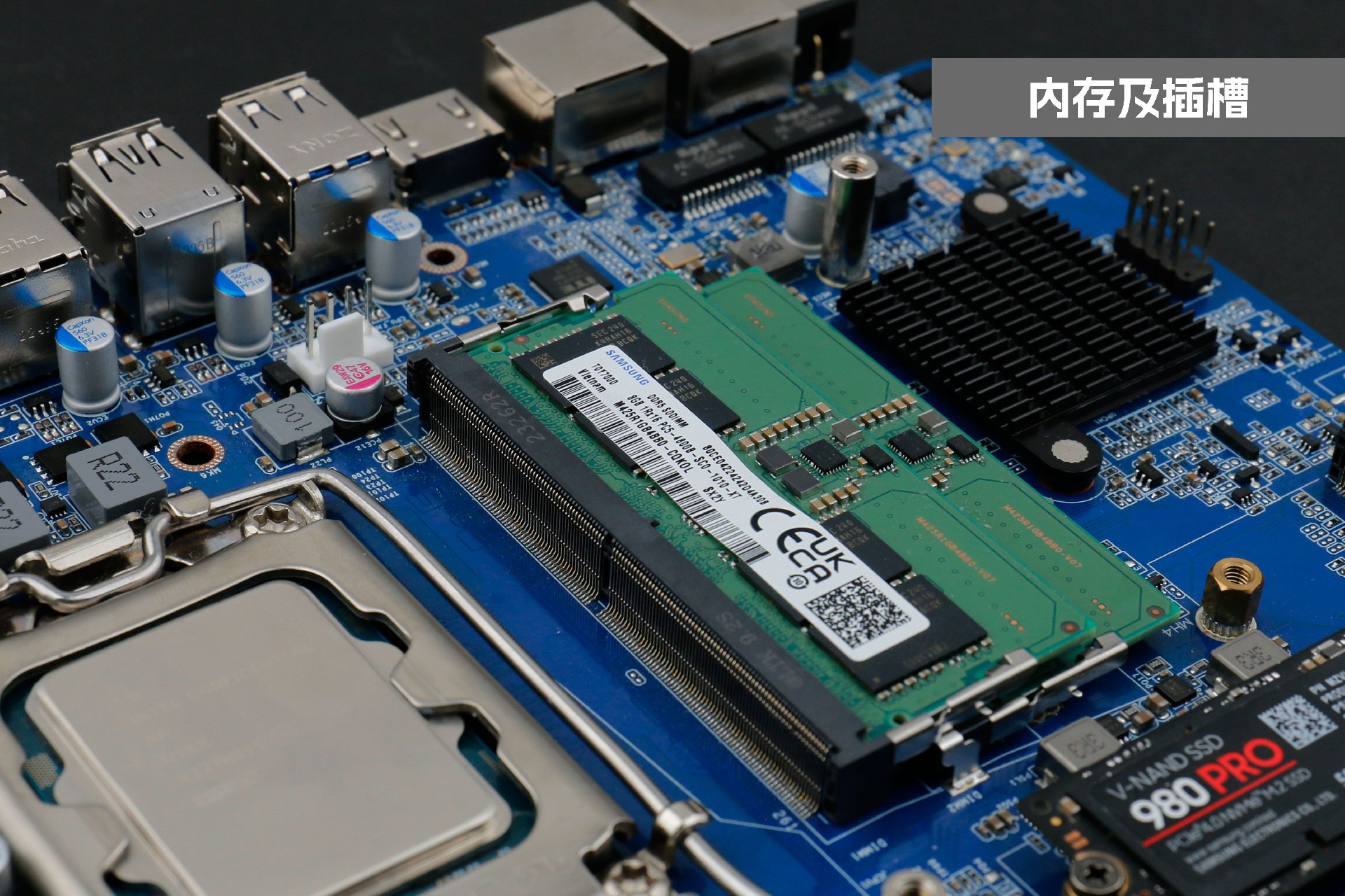 博天堂(btt)桌面云终端Y-BOX P3主板中部是内存插槽,采用双通道笔记本内存槽设计,最大支持容量可达64GB,最高支持DDR5-5600MHz频率,比 DDR4 至高标准数据速度 3200MT/S多传输 1.75 倍,横插的形式可以减少主板的占用体积,使整体机身更紧凑,内存顶部的风扇起到高效散热的作用。