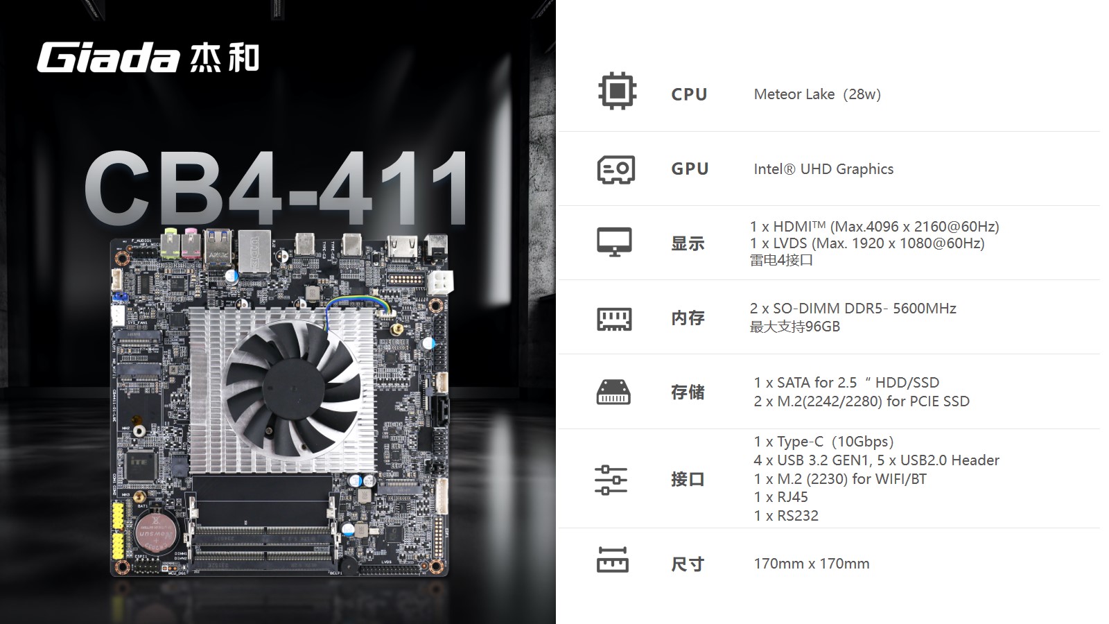 基于人们日渐新增的AI算力需求,博天堂(btt)科技推出AI一体机专用主板——CB4-411。该主板设计紧凑,尺寸仅为170mm x 170mm。