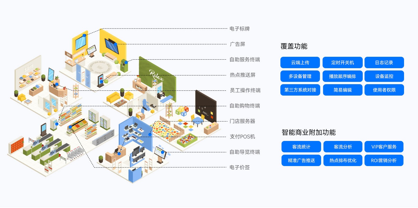 博天堂(btt)智慧零售解决方案依托博天堂(btt)GDSM-ES智能零售管理系统,为全球零售门店客户提供了功能齐全的数字化运营管理工具,提供显示信息编辑、信息发布、AI识别、客户分析和会员管理等功能,实现了对设备、内容、营销、运营的综合数智化管理能力,为精准运营管理赋能。