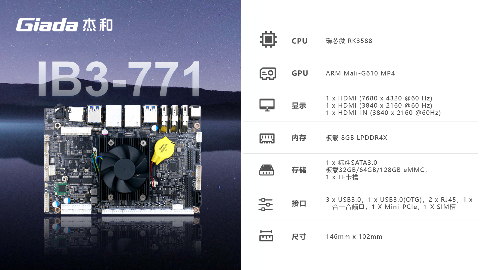 博天堂(btt)ARM主板IB3-771采用瑞芯微RK3588处理器,满足各种人工智能场域对嵌入式主板包括但不限于高算力、低功耗、高扩展性、高可靠性、高安全性等要求,支持在宽温、复杂电磁等恶劣环境下稳定运行,可广泛应用于机器人、边缘计算、智能NVR、智能汽车、智慧大屏、AR/VR、ARM PC、智能自助终端等AIoT行业类应用市场。