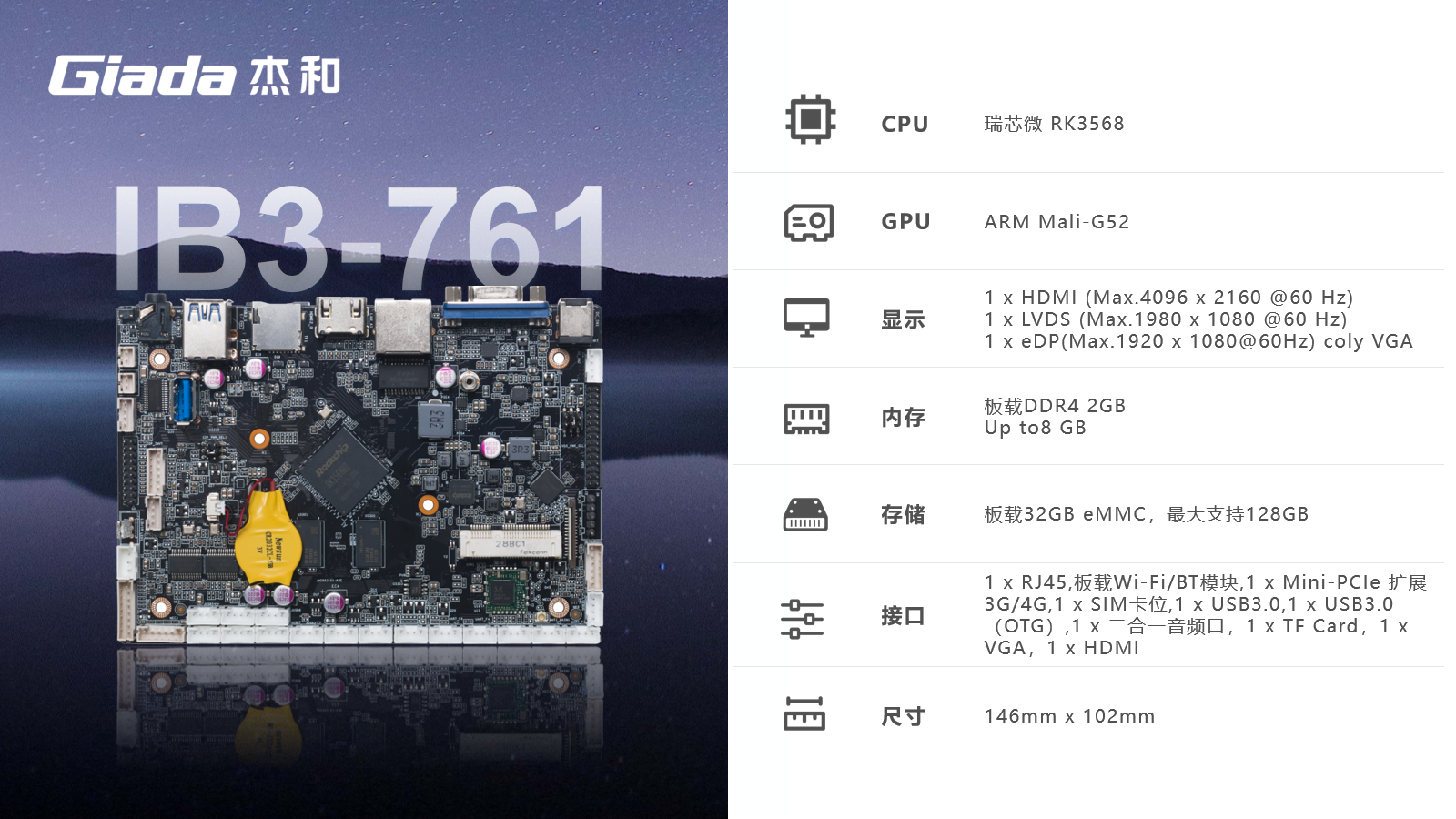 博天堂(btt)ARM主板IB3-761基于瑞芯微RK3568四核64位处理器开发,可实现多任务并行、更大数据集的高效处理,丰富的接口,具有性能强、内存大、集成度高、扩展能力强等特点,在处理速度和图形处理能力方面都表现出色,可广泛应用于物联网网关、边缘存储、工控平板、工业检测、工控盒、自助终端、云终端、车载中控、机器人等行业定制市场。
