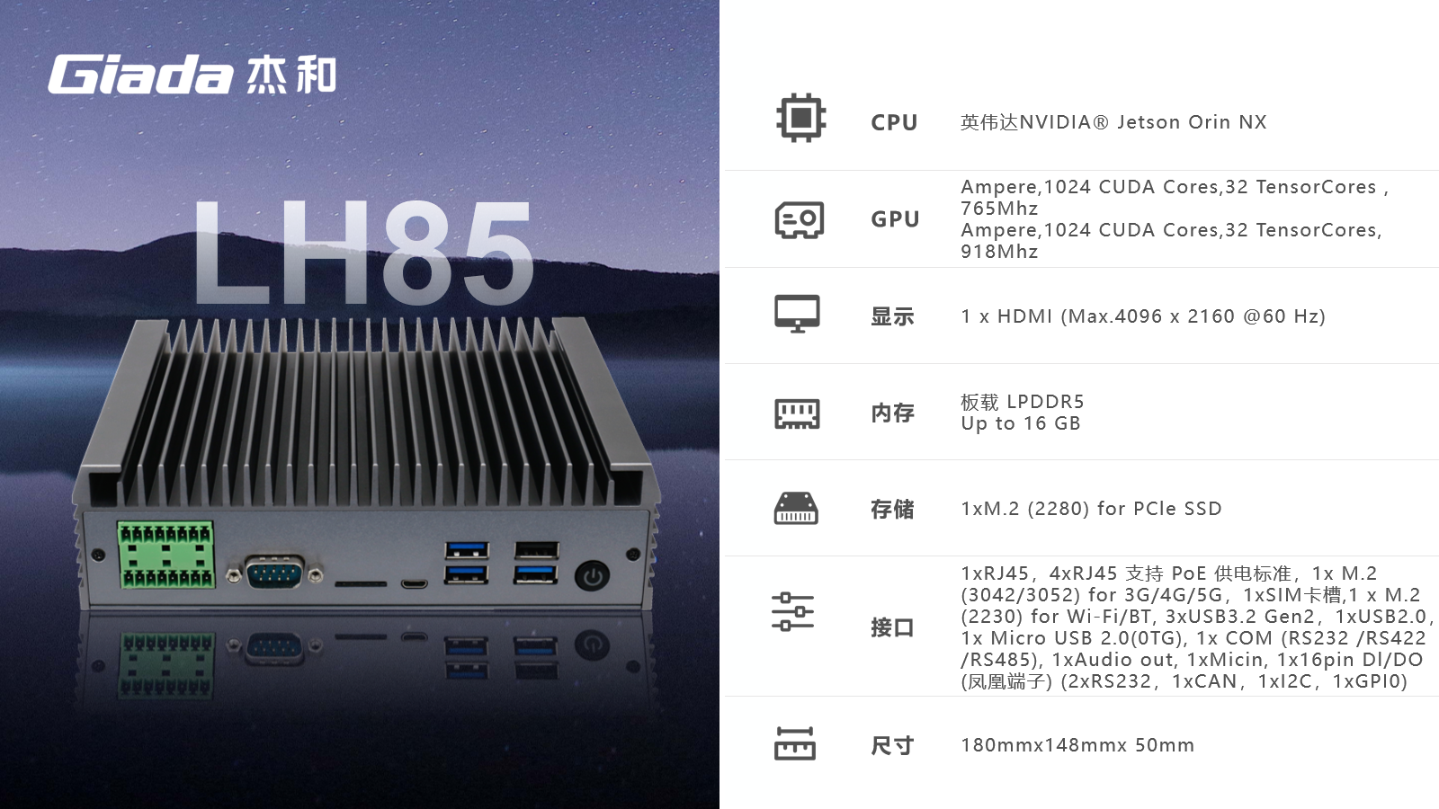 博天堂(btt)边缘计算产品LH85基于NVidia® Jetson Orin NX套件方案开发,100TOPS超强算力,具备强大的接口配套能力,是全新推出的一代针对边缘计算的创新产品,定位于为工业控制领域客户的AI应用提供强大的算力支持和充足的通信、控制接口保障,可广泛应用于智能制造、机器视觉、AGV、智慧城市等领域。