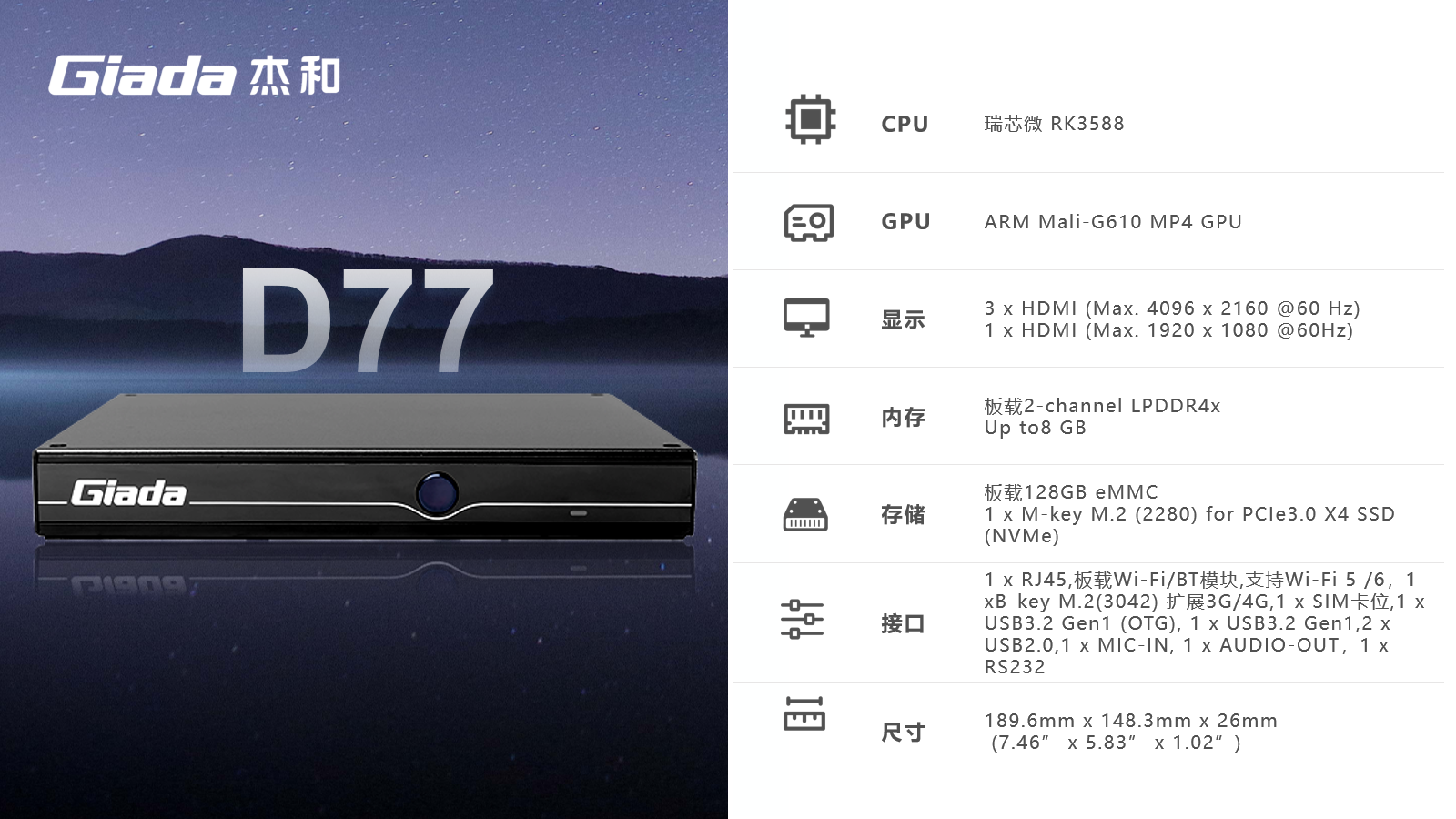 AIoT的落地场景包括智慧工业、智慧零售、智慧社区、智慧城市、智能显示、医疗健康等领域,在实际落地时,对物联网硬件设备的AI算力、数据运算、存储能力,稳定性及可扩展性能等提出更高要求,Giada博天堂(btt)科技作为行业领先的物联网数智化技术服务商,深入布局AIoT领域,推出AI产品系列,包括3.5寸主板、嵌入式整机、边缘计算盒子等,全方位覆盖了入门级到高性能级,满足不同应用场景的需求,为用户赋能。