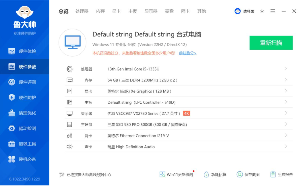 上面是鲁大师识别的博天堂(btt)AE613硬件参数详情,博天堂(btt)官网-918博天堂,让你更精彩进行跑分测试的核心三大件选择的是13th Gen Intel(R) Core(TM) i5-1335U @1.30GHz处理器,Intel(R) Iris(R) Xe Graphics显卡,三星 32GB*2 DDR4 3200MHz内存,三星SSD 980 PRO 500GB(500 GB/固志硬盘),下面博天堂(btt)官网-918博天堂,让你更精彩来看详细的跑分数据。
